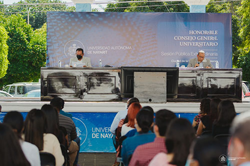 Se llevó a cabo la primera sesión pública extraordinaria del Honorable Consejo General Universitario (CGU), del ciclo escolar 2021-2022, la cual estuvo presidida por Jorge Ignacio Peña González, rector de la Universidad Autónoma de Nayarit (UAN), en su calidad de presidente del CGU, acompañado del consejero secretario Adrián Navarrete Méndez, en el Ágora del campus Ciudad de la Cultura Amado Nervo.